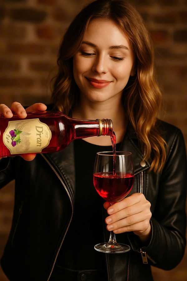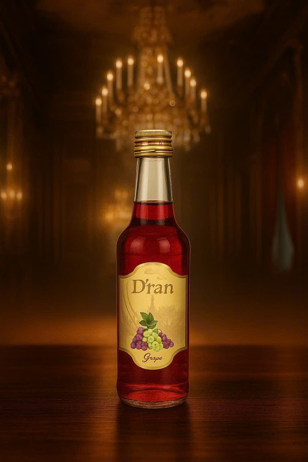 Chai thủy tinh thanh lịch, nhãn chai mang hình ảnh kiến trúc cổ kính của thị trấn D’ran, kết hợp với cụm nho xanh – tím rực rỡ tạo nên tổng thể vừa truyền thống, vừa nổi bật trên quầy bar hiện đại.